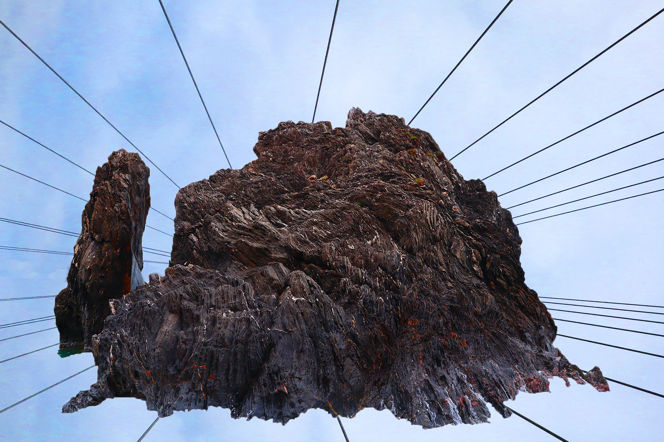 Brückenfelsen Collage eines ausgeschnittenen Felsens und dem Foto einer Brücke mit langen Seilen, die in alle Richtungen zeigen.